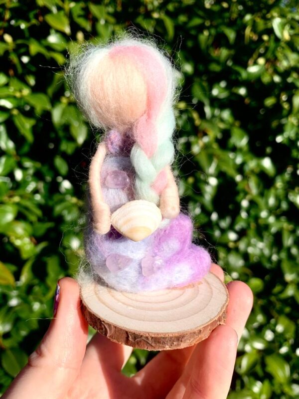 She is made out of a lovely array of colours, she also has amethyst chips and little shells to enhance her beauty and is ready for her new home!